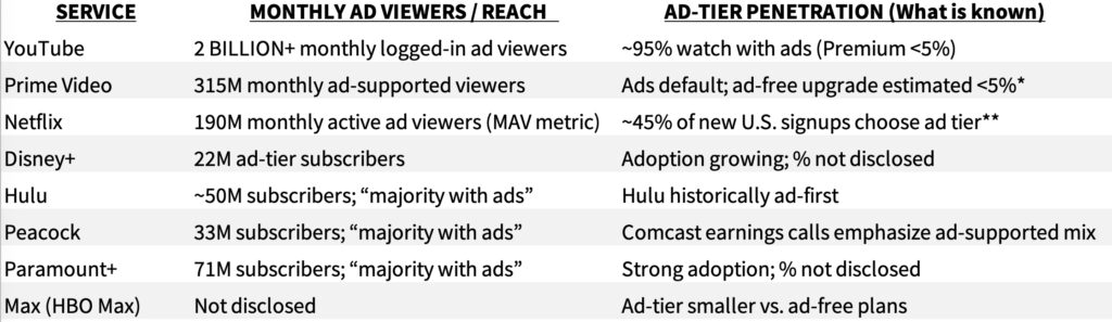 Meanwhile, YouTube remains the dominant ad-supported video platform, reporting more than 2 billion logged-in monthly viewers on connected TVs alone, and fewer than 5% of users pay for Premium.