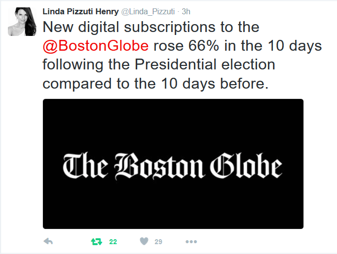 Regardless of where you fall on the political spectrum, we have learned one thing from this election – our country wants and needs change, and voters are more engaged than ever in the political conversation. They want to know what’s going on, and they are turning to trusted news outlets to provide them with that information. Recent subscription figures from the New York Times, the Wall Street Journal and the Boston Globe bear that out. Let’s take a look at how their numbers have changed in the wake of the election.